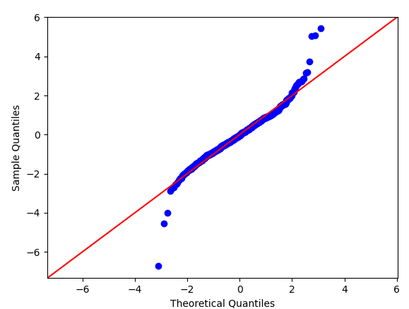 | sm.qqplot( ) | sm.qqplot(res, fit=True, line='45') sm.qqplot( 잔차 , 직선 ) |