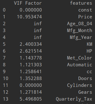 Age_08_04 , Mfg_Month , Mfg_Year 의 다중공선성 값이 inf로 무한대이기 때문에 변수를 제거하는 게 맞지만