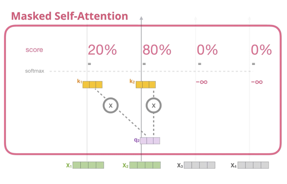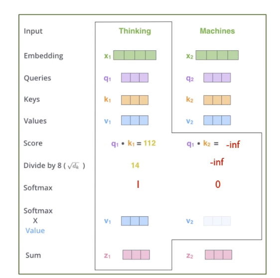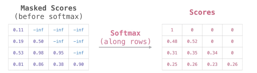 Masking을 수학적으로 구현할 때는 포지션에 해당하는 Score 값을 -inf ( 마이너스 무한대 ) 값으로 표기함으로써 구현할 수 있다.