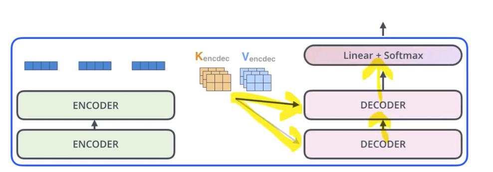 인코더를 지나온 값들이 해당하는 Key , Value 를 가지고 각각의 디코더(Decoder)의 영향을 미쳐서 결과로 나오게 됨