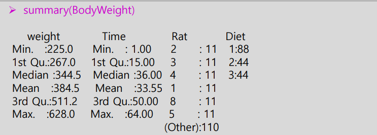 ③ 명령어 ‘mean(BodyWeight$Diet)’는 오류를 발생시킨다.