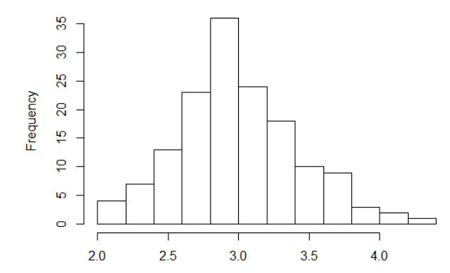 | describe(x) vars n mean sd median trimmed mad min max range skew 1 100 5.34 3.39 4.77 4.91 3.25 0.43 15.47 15.04 1.02 kurtosis se 0.73 0.34 |