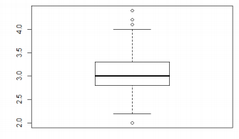 | 위 상자그림은 iris$Sepal.Width이며, 중앙값은 약3.0,1사분위수 약2.8,3사분위수약 3.3 lowerwhisker 약 2.2,upper whisker 약 4.0 이다 |