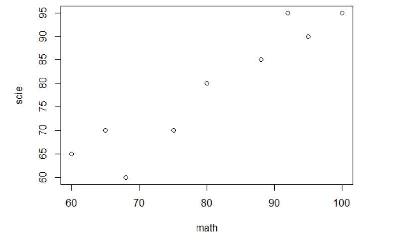 | math<-c(95,65,80,92,60,75,88,100,75,68) scie<-c(90,70,80,95,65,70,85,95,70,60) plot(math,scie) |