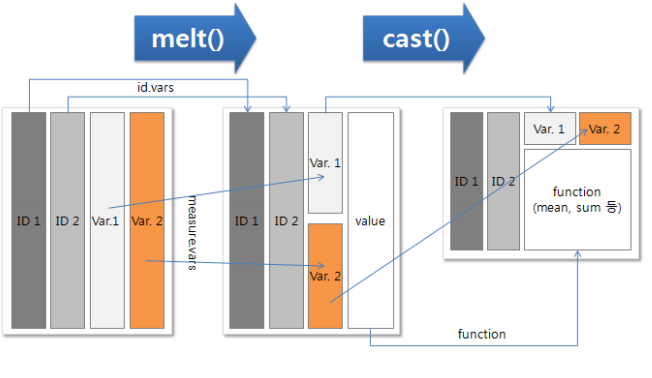 melt() 와 cast() 만을 사용하여 데이터를 재구성하거나 유연하게 만든다.