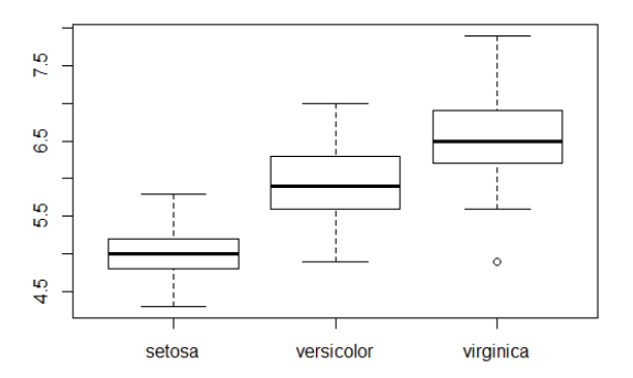 | plot(Species, Sepal.Length) # x 축이 범주형이기때문에 상자그림 생성 |
