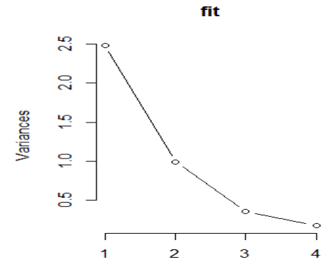 | Importance of components: PC1 PC2 PC3 PC4 Standard deviation 1.5749 0.9949 0.59713 0.41645 Proportion of Variance 0.6201 0.2474 0.08914 0.04336 Cumulative Proportion 0.6201 0.8675 0.95664 1.00000 |