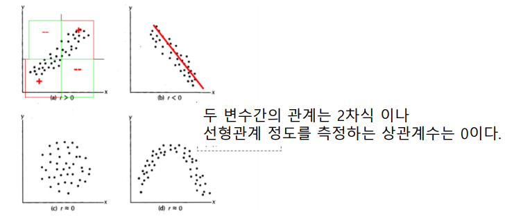 그러나 , 상관계수가 0 이라고해서 상관관계가 없는 건 아니다. ( 곡선관계에서는 상관계수가 = 0 )