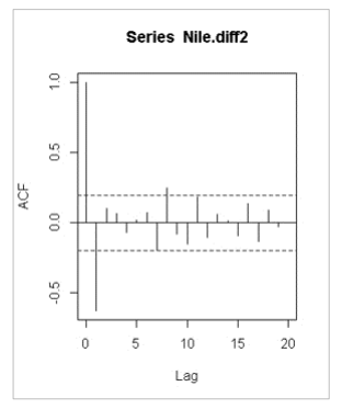 (점선 안으로 들어오면 절단이라 함) Lag 1에서 -0.6 정도의 값을 갖고, Lag 2부터 점선 안의 경계로 들어와서 ‘절단’ 된 상태입니다. 2번 째에서 절단. 2-1 차수 MA(0,1) |