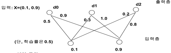 - 첫 번째로 입력벡터와 뉴런들간의 연결강도를 임의의 값으로 초기화 한다.