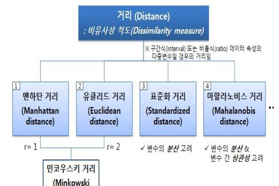 - 맨하탄 거리와 유클리드 거리 = 민코우스키 거리의 r 값에 따라 나뉜다.