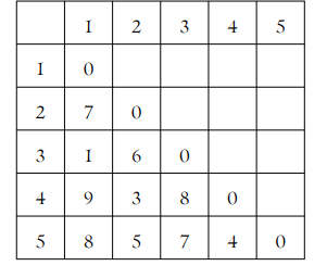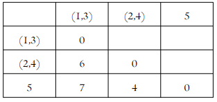 | 거리 행렬 갱신 d((1,3),(2,4))=min(d(1,3),2),d((1,3)),4)}=min{6,8}=6 d((2,4),5)=min(d(2,5)),d((4,5)}=min{5,4}=4 |