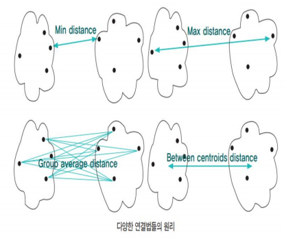 모든 항복에 대한 거리 평균을 구하면서 군집화 ( 계산량이 불필요하게 많아질 수 있다.) |