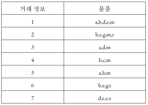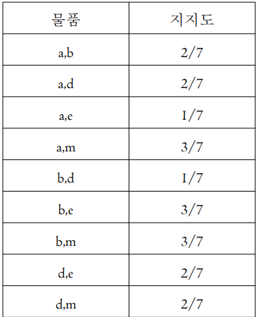 반복적으로 수행해 최소지지도(최소 신뢰도)가 넘는 품목집합을 찾는다.