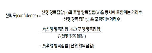 신뢰도(A->B): 물품 A를 구매했다는 조건하에 물품 B를 구매확률 =P(B|A) 조건부 확률